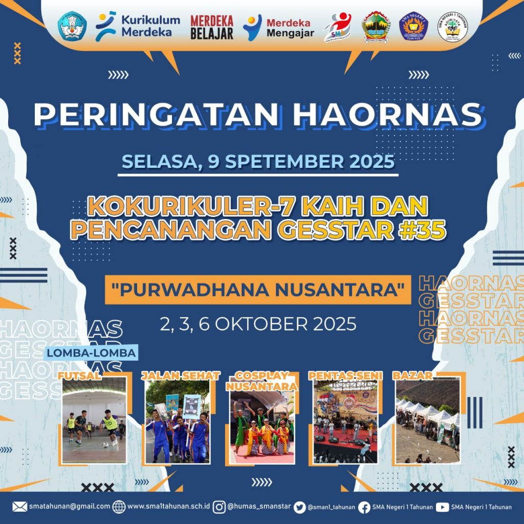 Tahunan, 9 September 2025 – SMA Negeri 1 Tahunan menggelar rangkaian kegiatan Hari Olahraga Nasional (HAORNAS) 2025 dengan penuh semangat di lingkungan sekolah. Acara dibuka secara resmi oleh Kepala Sekolah, Ibu Ida Fitriningsih, S.Pd., M.Pd., melalui apel pagi dan pencanangan GESSTAR ke -35 di lapangan belakang sekolah.
