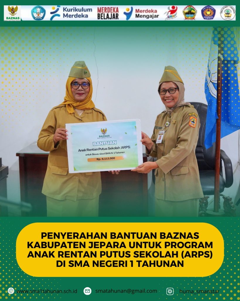 Tahunan – SMA Negeri 1 Tahunan menerima bantuan Program Anak Rentan Putus Sekolah (ARPS) dari BAZNAS Kabupaten Jepara sebagai bentuk kepedulian terhadap keberlanjutan pendidikan siswa. Penyerahan bantuan tersebut dilaksanakan secara simbolis di lingkungan SMAN 1 Tahunan dan diterima langsung oleh pihak sekolah.